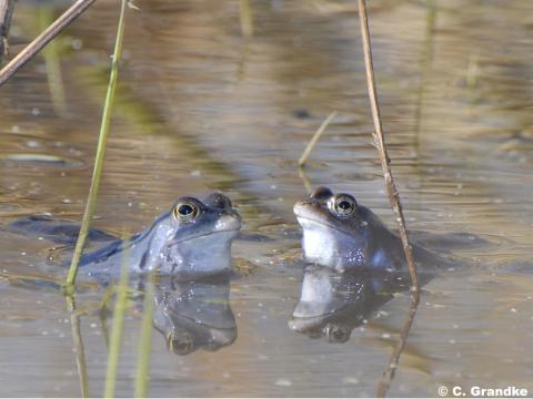 Ein typischer Auenbewohner ist der Moorfrosch (Rana arvalis), dem wir bei einer kleinen Wanderung im südlichen Auwald begegnen wollen. Amphibien, wie auch die Moorfrösche, sind hervorragende Indikatoren für die Gesundheit eines Biotops und seiner Lebensgemeinschaften. Der Moorfrosch fasziniert durch seine blaue Färbung der Männchen, die aber nur während der kurzen Paarungszeit vorhält. Wir laden sie ein dieses Himmelblau zu bestaunen, aber auch zu erfahren, welche Gefahren auf diesen und andere Frösche und Amphibien lauern. So sind weltweit Amphibien seit vielen Jahren schwerwiegenden Bedrohungen ausgesetzt, eine davon ist die Chytridiomykose, ein pathogener Pilz, der nur Amphibien befällt. Über 500 Arten sind bereits mit diesem infiziert - einige mit dem Pilz infizierte sterben, andere fungieren als potentielle Überträger des Pilzes auf andere Arten. Leider kommt auch der Mensch als "Ausbreiter" von Sporen dieses Pilzes in Frage.